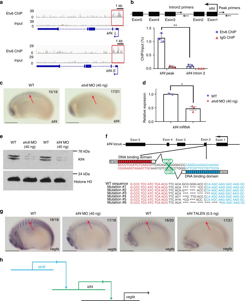 Fig. 4. Etv6 positively regulates vegfa expression through transcriptional activation of klf4. a IGV showing Etv6 peaks (red boxes) in the TSS region of klf4.L and klf4.S. Input is shown as control. For the peak tracks of individual replicates, see Supplementary Figure 13. b ChIP-qPCR analysis confirming that Etv6 is enriched in the klf4 promoter region. The diagram above the histogram depicts the klf4 locus and the location of the primers used to amplify the region of the Etv6 peak in the klf4 TSS region (peak primers) and a negative control region in intron2 (intron2 primers). Primers were designed to target both klf4.L and klf4.S. IgG ChIP was used as negative control. Error bars represent SEM of three biological replicates. **Pâ=â0.0036, two-tailed Studentâs t-test. (c) WISH showing that klf4 expression in the somites (arrows) is downregulated in Etv6-deficient embryos (scale bars: 0.5âmm). d RT-qPCR confirming that klf4 is downregulated in stage 22 Etv6-deficient somites. Expression was normalized to odc1. Error bars represent SEM of three biological replicates. *Pâ=â0.020, two-tailed Studentâs t-test. e Western blot showing that Klf4 protein is depleted in Etv6-deficient embryos and that klf4 MO blocks efficiently the translation of Klf4. Histone H3 was used as a loading control. f Klf4 TALEN design. Top, diagram showing the sequences in klf4 exon 2 targeted by the TALENs; bottom, DNA alignment showing the range of mutations generated by TALEN activity. Genomic DNA was obtained from stage 22 WT and TALEN-injected somites, and subjected to Sanger sequencing. TALEN-injection caused mutations in 78% of the clones sequenced. g WISH showing that vegfa expression in the somites (arrows) is downregulated in both klf4 MO- and klf4 TALEN-injected embryos (scale bars: 0.5âmm). h Diagram illustrating that Etv6 positively regulates vegfa expression in the somites through transcriptional activation of klf4, a transcriptional activator of vegfa |