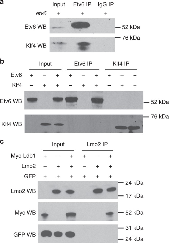 Fig. 6. Etv6 and Klf4 interact indirectly with each other. a In vivo immunoprecipitation assay showing the interaction between Etv6 and Klf4. Protein extracts from the somites of stage 22 embryos overexpressing etv6 mRNA were used for immunoprecipitation. Input lane: somite extracts from embryos injected with exogenous etv6 mRNA; IgG immunoprecipitation: negative control. b In vitro immunoprecipitation assay showing that Etv6 and Klf4 do not directly interact. The Etv6 and Klf4 proteins were synthetized from mRNA using the in vitro rabbit reticulocyte lysate translation system, extracted and used in immunoprecipitation assays with Etv6 antibodies (Etv6 IP) or Klf4 antibodies (Klf4 IP). c In vitro immunoprecipitation assay between two proteins known to physically interact with each other, Lmo2 and Ldb1, was performed as in (b) with Lmo2 antibodies (Lmo2 IP). The GFP protein serves as a negative control |