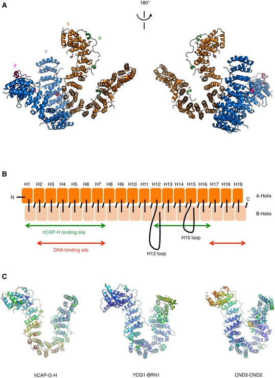 Figure 1. Domain architecture and overall structure of the hCAP‐G‐H subcomplex