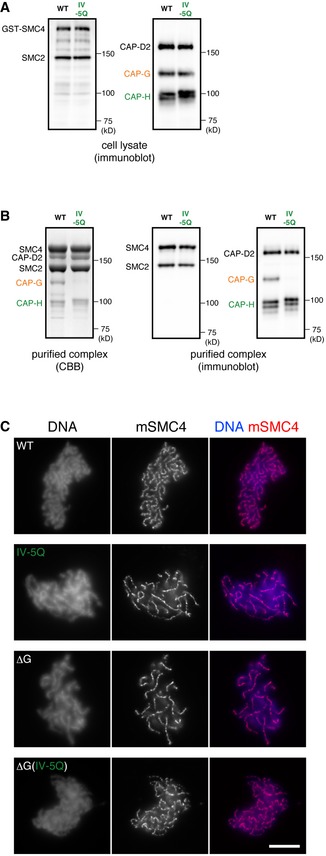 Expression of condensin I subunits in insect cells. The wild‐type (WT) or IV‐5Q mutant CAP‐H subunit was co‐expressed with the other four subunits (GST‐SMC4, SMC2, CAP‐D2, and CAP‐G) in insect cells. Cell lysates were prepared and subjected to SDS–PAGE, followed by immunoblotting with a mixture of antibodies against SMC2 and SMC4 (left panel) or against CAP‐D2, CAP‐G, and CAP‐H (right panel).Purification of the WT and IV‐5Q mutant condensin I complexes. Protein samples purified through glutathione‐affinity chromatography were subjected to SDS–PAGE and analyzed by CBB staining (left panel) or immunoblotting with a mixture of antibodies as described above (middle and right panels).Add‐back assay using the WT and mutant condensin I complexes. Xenopus extracts depleted of endogenous condensin complexes were supplemented with the purified complexes (from top to bottom; WT, IV‐5Q, ΔG, ΔG[IV‐5Q]). The supplemented extracts were then incubated with sperm nuclei to assemble mitotic chromosomes. The samples were fixed and labeled with an antibody against mSMC4 (red). DNA was counterstained with DAPI (blue). The data from a single representative experiment out of two repeats are shown. In the experiment shown here, multiple images were collected for condensin‐depleted extracts supplemented with the WT (n = 17), IV‐5Q (n = 22), ΔG (n = 20), and ΔG(IV‐5Q) (n = 25) complexes. The scale bar represents 10 μm.