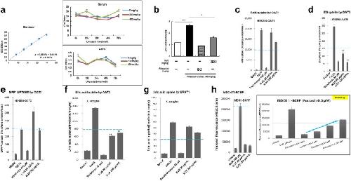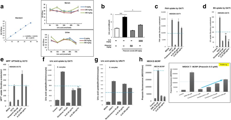 Fig. 1. Inhibition of uric acid and transporters by K-25 in vivo model. a In vivo uric acid level was determined using the uric acid assay kit. Uric acid detection analyses showed urine and serum levels of uric acid at 6–72 h after PO injection in different groups of mice as indicated. Concentration of PO: 0 mg/mL (blue line), 200 mg/mL (red line), 400 mg/mL (green line). b Effects of K-25 on serum in hyperuricemia mice. Mice were pretreated with 400 mg/mL of PO for 3 days prior to 300 mg/mL of K-25 treatment for 72 h. Values are mean ± standard error of the mean. **p < 0.01, compared to the PO-treated control. The specific substrates used were (c) [3H]PAH for OAT1, (d) [3H]ES for OAT3, and (e) [3H]MPP+ for OCT2 in the HEK293 overexpressing system. (f, g) Inhibitory effect of K-25 on uric acid uptake by OAT1 and URAT1 transporters in Xenopus oocytes. h Transcellular transport of prototypical substrates of BCRP was measured using monolayers of MDCK cells transfected with the MDCK genes, or of MDCK-WT control cells seeded on transwell membranes. Prazosin (2 μM), a substrate of BCRP was incubated with the MDCK-BCRP cell lines. All values are mean ± SD (triplicate in each experiment; each experiment was repeated three times). **p < 0.01, compared to OAT3. The statistical significance (*p < 0.05, **p < 0.01, ***p < 0.001) was determined using an one-way analysis of variance (ANOVA) with Bonferroni correction