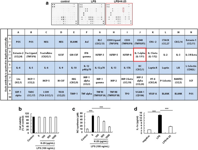 Fig. 2. Inhibition of LPS-induced NO production and IL-1α secretion by K-25. Raw 264.7 cells were pretreated with various concentrations of K-25 for 1 h before LPS (100 ng/mL) treatment. a After 24 h-incubation, the cultures were subjected to cytokine antibody array assay. b After 24 h-incubation, cell viability was measured using the EZ-cytox assay kit. c After 24 h of incubation, NO production was measured using the Griess Reagent System assay. d After 24 h-incubation, the culture medium was assayed using ELISA for IL-1α. Values represent mean ± standard error of the mean. **p < 0.01, compared to the LPS control. The statistical significance (*p < 0.05, **p < 0.01, ***p < 0.001) was determined using ANOVA with Bonferroni correction