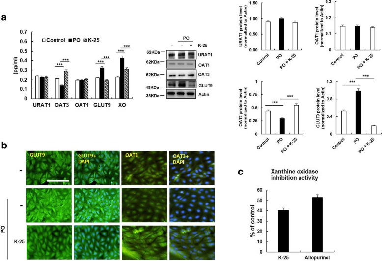 Fig. 4. Inhibition of PO-induced hyperuricemia by K-25. LLC-PK1 cells were stimulated with PO (0.25 mM) with or without pretreatment with K-25 (0.5 mg/mL). a After 24 h of incubation, OAT1, OAT3, URAT1, GLUT9, and XO were measured using an immunoblot assay. b LLC-PK1 cells were incubated with K-25 for 24 h, and the intracellular levels of OAT3 and GLUT9 transporters were analyzed using immunofluorescence analysis. Scale bar = 50 μm. c Effect of K-25 on XO inhibition activity. Values are represented as means ± SEM, *p < 0.05, versus the allopurinol group. The statistical significance (*p < 0.05, **p < 0.01, ***p < 0.001) was determined using ANOVA with Bonferroni correction