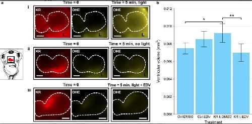 FIGURE 2 KillerRedâinduced hypertrophy is caused by superoxide production. (a) (i) Exposure of KillerRed (KR) expressing tadpoles to green light at NF stage 42 produces superoxide radicals, indicated by an increase in dihydroethidium (DHE) fluorescence in the heart (outlined). âLâ marks the liver, which is autofluorescent. (ii) Without light activation, KillerRed produces no superoxides. (iii) Exposure of KillerRedâexpressing tadpoles to the ROS scavenger edaravone (EDV) prevents lightâinduced production of superoxides. All scale bars are 100μm. (b) Exposure of KillerRedâexpressing tadpole hearts to EDV suppresses the lightâinduced ventricular hypertrophy seen in DMSO controls. Mean ventricular volume is shown (n = 34â39 tadpoles, N = 2 replicates), with error bars indicating 95% confidence intervals. *p < 0.05; **p < 0.01 (ANOVA with Tukey post hoc)