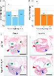 Figure 4. Cardiac progenitor genes are upregulated at 3 days postâlight activation. (a) KillerRedâexpressing tadpole hearts exposed to light show a significant increase in expression of Gata4 relative to uninjected controls at 3âdays postâlight exposure (*p < 0.05; KruskalâWallis test). Changes in Gata4 expression were measured relative to Eef1a expression as an endogenous control. Error bars indicate SEM of dCt values. n = 10 tadpoles per replicate, N = 6 replicates. (b) KillerRedâexpressing tadpole hearts exposed to light show a significant increase in expression of Nkx2.5 relative to uninjected controls at 3 days postâlight exposure (**p < 0.01; KruskalâWallis test). Changes in Nkx2.5 expression were measured relative to Eef1a expression as an endogenous control. Error bars indicate SEM of dCt values. n = 10 tadpoles per replicate, N = 5 replicates. (c) In situ hybridization for Gata4 and Nkx2.5 shows that there is no change in which tissues these genes are expressed in following light activation of KillerRedâexpressing tadpole hearts. Both genes are expressed, among other tissues, in the myocardium of the ventricle (blue arrow), the myocardium of the outflow track (red arrow), and the inner lining (endocardium or apical myocardium) of the atrium (green arrow). Representative images from 3 days postâlight activation are shown here. Scale bar = 100 μm. Section thickness = 10 μm
