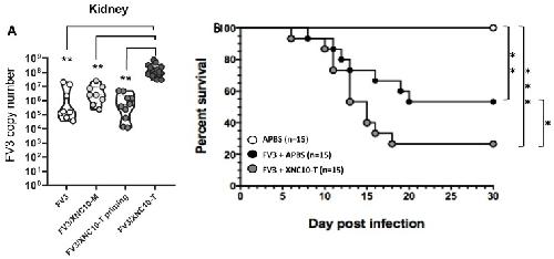 Figure 5. Specificity and long term impact of transitory iVα6T cell depletion. (A) Three week-old (stage 55) tadpoles were injected with either 1 μg XNC10-tetramers (FV3/XNC10-T), 1 μg XNC10-monomers (FV3/XNC10-M), or vehicle control (FV3/APBS) 1 day pre and 1 day post i.p. infection with 10,000 PFUs of FV3 (n = 8), and kidneys were collected at 6 dpi. The last group (FV3/XNC10-T priming) was first injected with 1 μg XNC10-tetramers, then 3 days later infected with FV3, and kidneys were collected at 6 dpi. Viral loads were assessed by absolute qPCR with primers against FV3 polymerase II. The results are combined from two separate experiments, and each dot represents an individual tadpole; ** p < 0.01 above the line denotes statistically significant differences between the indicated groups (One way ANOVA followed by Tukeyâs multiple comparison test). (B) Three week-old (stage 55) tadpoles were injected with either 1 μg XNC10 tetramers (FV3/XNC10-T) or vehicle control (FV3/APBS) 1 day pre, and 1 day post were i.p injected with 10,000 PFUs of FV3 (n = 15) and survival was monitored daily over a 30-day period. Survival was determined using Kaplan-Meier, * p < 0.05, ** p < 0.005, and *** p < 0.0005. Uninfected controls (white circle), FV3 infected tadpoles (black circle), and XNC10 tetramer treated FV3 infected tadpoles (grey circle). |