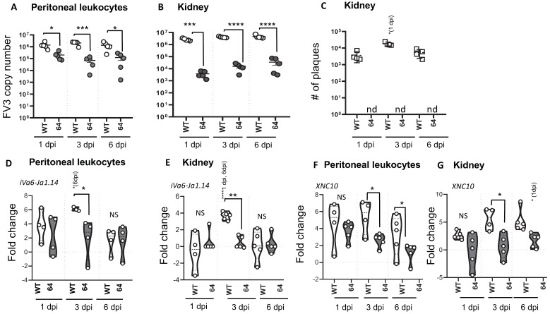 Figure 2. Magnitude of iVα6 T cell response in adult frogs is associated to the level of viral replication and production of infectious particles. PLs and kidneys were collected at 1, 3, and 6 dpi from adult frogs infected with 1 × 106 PFUs of WT-or ∆64-FV3. FV3 genome copy number by absolute qPCR in PLs (A) and kidneys (B) were determined. The total number of infectious particles (nd: not detected) in the kidney was determined by plaque assay (C).Gene expression of iVα6-Jα1.43 and XNC10 in PLs (D,F) and kidneys (E,G) were determined relative to an endogenous control (GAPDH) and fold changes were calculated using mock-infected frogs as a control. Each dot represents an individual animal (n = 4–5). The line intersecting the y-axis at 0 represents the APBS control that the fold changes of the treatments are in relation to. Note: * p < 0,05; ** p < 0.01; *** p < 0.001, and **** p < 0.0001 above the line denotes statistically significant differences between the different treatment groups; significant differences between time points within each treatment group are indicated within parentheses; NS indicates no significant differences (one way ANOVA and Dunns’s multiple comparison test). |
