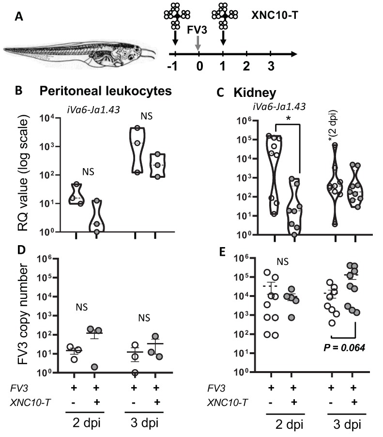 Figure 4. XNC10 tetramer-mediated iVα6T cell depletion in tadpoles affects iVα6-Jα1.43 transcript levels and viral replication. PLs and kidneys were collected from three week-old (stage 55) tadpoles that had been injected with 1 μg XNC10 tetramers (XNC10-T) or vehicle control 1 day pre, and 1 day post i.p. injected with 10,000 PFUs of FV3, at the indicated time points (n = 9). A schematic of the injection regime is shown in (A). Gene expression of iVα6-Jα1.43 in PLs (B) and kidneys (C) is shown. Results are normalized to an endogenous control and presented as relative expression compared with the lowest observed value according to the ââCt method. FV3 loads in PLs (D) and kidneys (E) were measured using absolute qPCR with primers against FV3 polymerase II. For PLs, each dot represents a pool of 3 tadpoles, while for kidneys, each dot represents a single tadpole; * p < 0.05 denotes statistically significant differences between the indicated groups; NS indicates no significant differences (One way ANOVA followed by Tukeyâs multiple comparison test). |