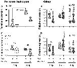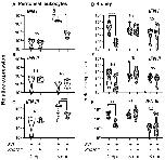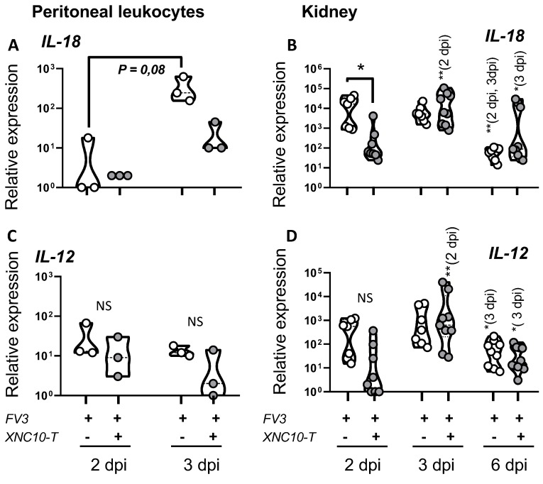 Figure 8. Effects of iVα6T cell depletion on IL-18 and IL-12 responses. PLs and kidneys were collected from three week-old (stage 55) tadpoles that had been injected with 1 μg XNC10 tetramers (XNC10-T) or vehicle control 1 day pre- and 1 day post-i.p. injection with 10,000 PFUs of FV3, at the indicated time points (n = 8–9). Quantitative gene expression of IL-18 (A,B) and type IL-12 (C,D) was determined relative to an endogenous control (GAPDH) and relative expression was calculated against the lowest observed expression according to the ∆∆Ct method (n = 9); * p < 0.05; ** p < 0.005, above the line denotes statistically significant differences between the different treatment groups; significant differences between time points within each treatment group is indicated within parentheses; NS indicates no significant differences (One way ANOVA followed by Tukey’s multiple comparisons test). |