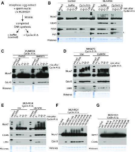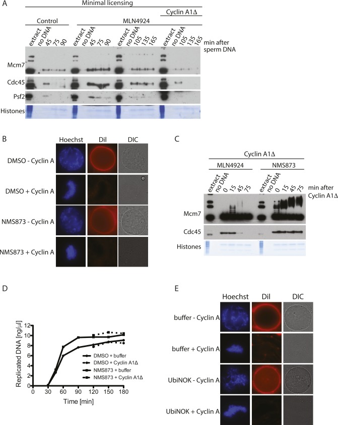 Figure S2. Unloading of replisomes in mitosis.(A) Mitotic replisome unloading from minimally licensed chromatin. DNA was minimally licensed by addition of geminin at 2 min after DNA sperm addition. The extract was then optionally supplemented with Cullin ligase inhibitor MLN4924 at 15 min after sperm DNA addition and chromatin isolated at time points during the S-phase (45, 75, and 90 min). Upon completion of DNA replication, the extract was optionally driven into mitosis with the addition of cyclin A1Δ and chromatin isolated at time points during mitosis (105, 135, and 165 min). Note that the time points 105, 135, and 165 min correspond to 15, 45, and 75 min after cyclin A1Δ addition presented in other figures. Isolated chromatin samples were analysed by immunoblotting with indicated antibodies. (B) Mitotic nuclear envelope breakdown in the presence of NMS873. The replication reaction was completed and optionally driven into mitosis by addition of cyclin A1Δ. p97 inhibitor NMS873 was optionally added at the same time as cyclin A1Δ. The nuclei assembled in the extract were visualised at 30 min post cyclin A1Δ addition by staining DNA with Hoechst 33258, staining nuclear membrane with Dil, and visualising the nuclear envelope by differential interference contrast (DIC) microscopy. (C) p97 is needed for mitotic replisome disassembly. Experiment as in Fig 1C but indicated inhibitors were present in the reaction throughout both stages of the cell cycle. (D) DNA synthesis kinetics in the presence or absence of p97 inhibitor NMS873 and cyclin A1Δ. Sperm DNA was replicated in extract optionally supplemented with NMS873. At 90 min, cyclin A1Δ was optionally added. DNA synthesis was analysed as in Fig S1A. (E) Mitotic nuclear envelope breakdown in the presence of UbiNOK. The replication reaction was completed and optionally driven into mitosis by addition of cyclin A1Δ. The chain-terminating mutant of ubiquitin UbiNOK was optionally added at the same time as cyclin A1Δ. The nuclei assembled in the extract were visualised as in (B).Source data are available for this figure. |
