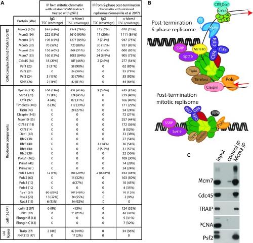 Figure 2. Composition of the replisome retained on mitotic chromatin.(A) The replication reaction was completed in egg extract supplemented with caffeine and p97 inhibitor NMS873. The extract was then driven into mitosis by addition of cyclin A1Δ. Chromatin was isolated at 60 min after cyclin A1Δ addition and chromatin proteins released from DNA. The DNA synthesis kinetics are provided in Fig S3A. Antibodies against Mcm3 (or control IgG) were used to immunoprecipitate replisomes, and the immunoprecipitated samples were analysed by mass spectrometry. The total spectral count for each identified replisome component is presented together with sequence coverage of analysed peptides. The results for this analysis of mitotic retained replisome are compared with the S-phase post-replication replisome reported in Sonneville et al (2017). (B) Schematic representation of the data presented in (A). (C) A small proportion of the material from the mitotic Mcm3 IP experiment in (A) was analysed by Western blotting with indicated antibodies. |