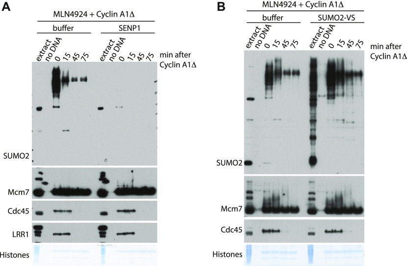 Figure 4. SUMOylation is not required for mitotic replisome disassembly.(A) The replication reaction was completed in the presence of Cullin ligase inhibitor MLN4924 and driven into mitosis by addition of cyclin A1Δ. At the same time as cyclin A1Δ, half of the sample was supplemented additionally with the active domain of SENP1. Chromatin samples were isolated at indicated time points and analysed as in Fig 1. Colloidal Coomassie-stained histones serve as a quality and loading control. A sample without DNA addition (no DNA) was processed alongside others as a chromatin specificity control. (B) As in (A) but instead of supplementing extract with SENP1, it was supplemented with SENPs inhibitor SUMO2-VS. |