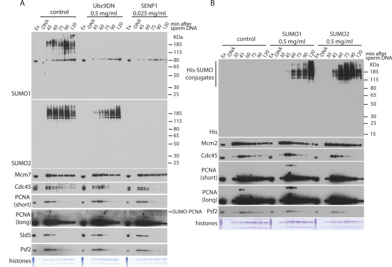 Figure S5. S-phase replisome disassembly is not affected by SUMOylation.(A) The replication reaction was performed in egg extract supplemented with the dominant negative mutant of Ubc9 (Ubc9DN) or active domain of SENP1. The chromatin samples were isolated at indicated time points and analysed by Western blotting with indicated antibodies as in Fig 1. (B) The replication reaction was performed in egg extract supplemented with 0.5 mg/ml of SUMO1 or SUMO2 (as indicated). The chromatin samples were isolated at indicated time points and analysed by Western blotting with indicated antibodies. Controls as in Fig 1. |