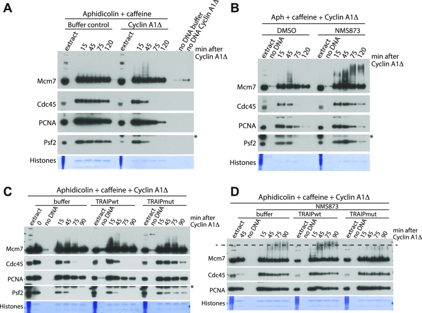 Figure 5. Mitotic unloading of stalled helicases.(A) The replication reaction was performed in egg extract supplemented with DNA polymerase inhibitor aphidicolin and checkpoint inhibitor caffeine. After 90 min of reaction, cyclin A1Δ was optionally added, and the chromatin samples were isolated during the reaction at indicated time points and analysed as in Fig 1. Colloidal Coomassie-stained histones serve as a quality and loading control. A sample without DNA addition (no DNA) was processed alongside others as a chromatin specificity control. An asterisk “*” by the Psf2 blot indicates the band of cyclin A1Δ that is recognised by the Psf2 antibody. (B) The inhibition of stalled replisomes was achieved as in (A), and the extract was driven into mitosis by addition of cyclin A1Δ and optional supplementation with p97 inhibitor NMS873. The chromatin samples were analysed as in (A). (C) Replication reaction was performed with addition of aphidicolin and caffeine, at 90 min, cyclin A1Δ was added and optionally: buffer, His/SUMO-TRAIPwt, or ligase dead His/SUMO-TRAIPmut (C25A) to a final concentration of 50 μg/ml. The chromatin samples were isolated at indicated time points and analysed with indicated antibodies. Time “0” sample was isolated at the replication completion time when cyclin A1Δ and recombinant TRAIP were added to the extract. (D) The experiment was performed as in (C) but with addition of p97 inhibitor NMS873 at the same time as cyclin A1Δ to accumulate ubiquitylated forms of Mcm7 on chromatin. His/SUMO–tagged TRAIPwt and mutant were added to a final concentration of 100 μg/ml. The sample isolated at 45 min without NMS873 provides a control for the replisome unloading without p97 inhibition. The dashed line on the Mcm7 blot runs through the middle of the ubiquitylation signal for Mcm7 in mitosis in the control (buffer) sample to aid comparison of chain lengths between samples. |