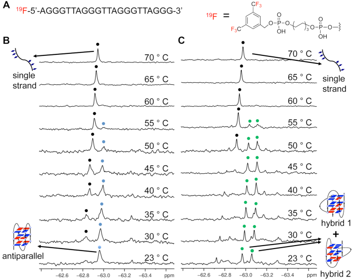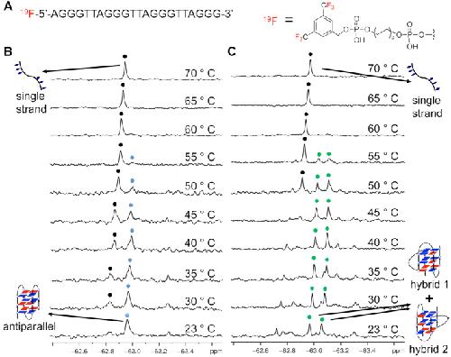19F NMR spectra of 19F-labeled 22-mer ODN 1 d[AGGG(TTAGGG)3] in Na+ and K+ solutions. (A) Chemical structure of 19F-labeled DNA bearing 19F group at the 5′ terminal. (B)19F NMR of 19F-labeled DNA at different temperatures in Na+ solution. (C) 19F NMR of 19F-labeled DNA at different temperatures in K+ solution. Blue and black spots indicated antiparallel G-quadruplex and single strand, respectively. Green indicated hybrid-1 and hybrid-2 G-quadruplexes conformations. Temperatures indicated on the right. Condition: 0.1 mM DNA in (B) 300 mM NaCl and 20 mM Na-PO4 buffer (pH 7.0) or (C) 100 mM KCl and 20 mM K-PO4 buffer (pH 7.0). The sample is kept for 10 min of each temperature for 19F NMR detection.