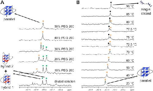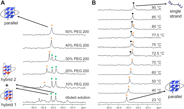 19F NMR spectra of 19F-labeled ODN 1 in PEG 200. (A) 19F NMR of 19F-labeled 22-mer DNA at different concentration of PEG 200 in K+ solution. (B) 19F NMR of 19F-labeled ODN 1 at different temperatures in 40% PEG 200. Green indicated hybrid-1 and hybrid-2 G-quadruplexes conformations. Orange and black spots indicated parallel G-quadruplex and single strand, respectively. PEG 200 ratio and temperatures indicated on the right. Condition: 0.1 mM DNA in 100 mM KCl and 20 mM K-PO4 buffer (pH 7.0). The sample is kept for 10 min of each temperature for 19F NMR detection.