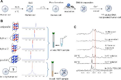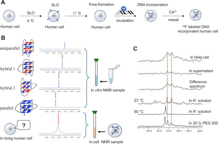 Figure 3. In-cell 19F NMR of 19F labeled ODN 1. (A) Schematic overview of the SLO treatment cell system for transfection DNA into HeLa cells. (B) Comparison with the position of reference in vitro spectrum provides a reliable determination of intracellular 19F-labeled DNA. (C) Comparison of 19F NMR spectra of ODN 1 in K+ solution, in HeLa cell, in supernatant, difference spectrum between HeLa cell and supernatant, in K+ solution (23 and 60°C) and in 30% PEG 200.