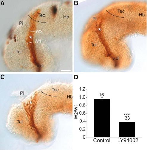Figure 7. PI3K signaling regulates the behavior of RGC axons at the mid-diencephalic turn. Lateral views of stage 40 wholemount brains with HRP-labeled optic tracts that were exposed at stage 33/34 either to (A) control DMSO solution (n = 16 brains, N = 3) or (B, C) 20 µM LY294002 (n = 33 brains, N = 3). Black line represents the approximate anterior border of the optic tectum, and the asterisk the location of the mid-diencephalic turn guidance choice point. D, The RGC axon stall phenotype was quantified by representing the width of the optic tract post-mid-diencephalic turn (W2) as a ratio (W2/W1) to the width of the optic tract (W1) at the mid-diencephalic turn. On each bar is the number of individual brains pooled from 3 independent experiments. Bars represent the mean ± SEM; ***p < 0.001 using the unpaired Studentâs t test. Scale bar, 50 µm. Hb, hindbrain; Pi, pineal gland; Tec, tectum; Tel, telencephalon; v.di, ventral diencephalon. |
