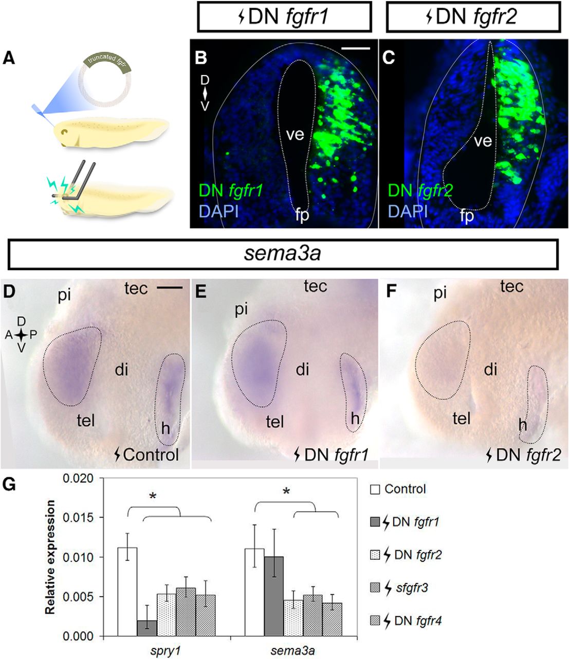 Figure 3. Fgfr2-4 inhibition downregulates sema3a in the forebrain. A, A cartoon of stage 27/28 forebrain electroporation. B, C, Embryos were electroporated with pCS2-DNfgfr1 (B) and pCS108-DNfgfr2 (C) and processed in transverse cryostat sections by FISH for fgfr1/2 at stage 32 to confirm transgene expression. DâF, Embryos were electroporated with control pCS2-GFP (D, n = 37 brains, N = 3), pCS2-DNfgfr1 (E, n = 20 brains, N = 3), or pCS108-DNfgfr2 (F, n = 16/24 brains had decreased expression, N = 3) and processed for sema3a expression by wholemount ISH at stage 32. G, sema3a mRNA levels in brains electroporated with truncated fgfrs was measured by RT-qPCR. spry1 was a readout of Fgfr inhibition. Bars represent mean ± SEM for control (n = 32, N = 4), DN fgfr1 (n = 24, N = 4), DN fgfr2 (n = 20, N = 3), sfgfr3 (n = 30, N = 4), and DN fgfr4 (n = 31, N = 4); *p < 0.05 statistical significance versus the control was determined using the REST algorithm. Scale bars, 50 µm. di, diencephalon; fp, floor plate; h, hypothalamus; pi, pineal gland; tec, optic tectum; tel, telencephalon; ve, ventricle. |