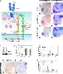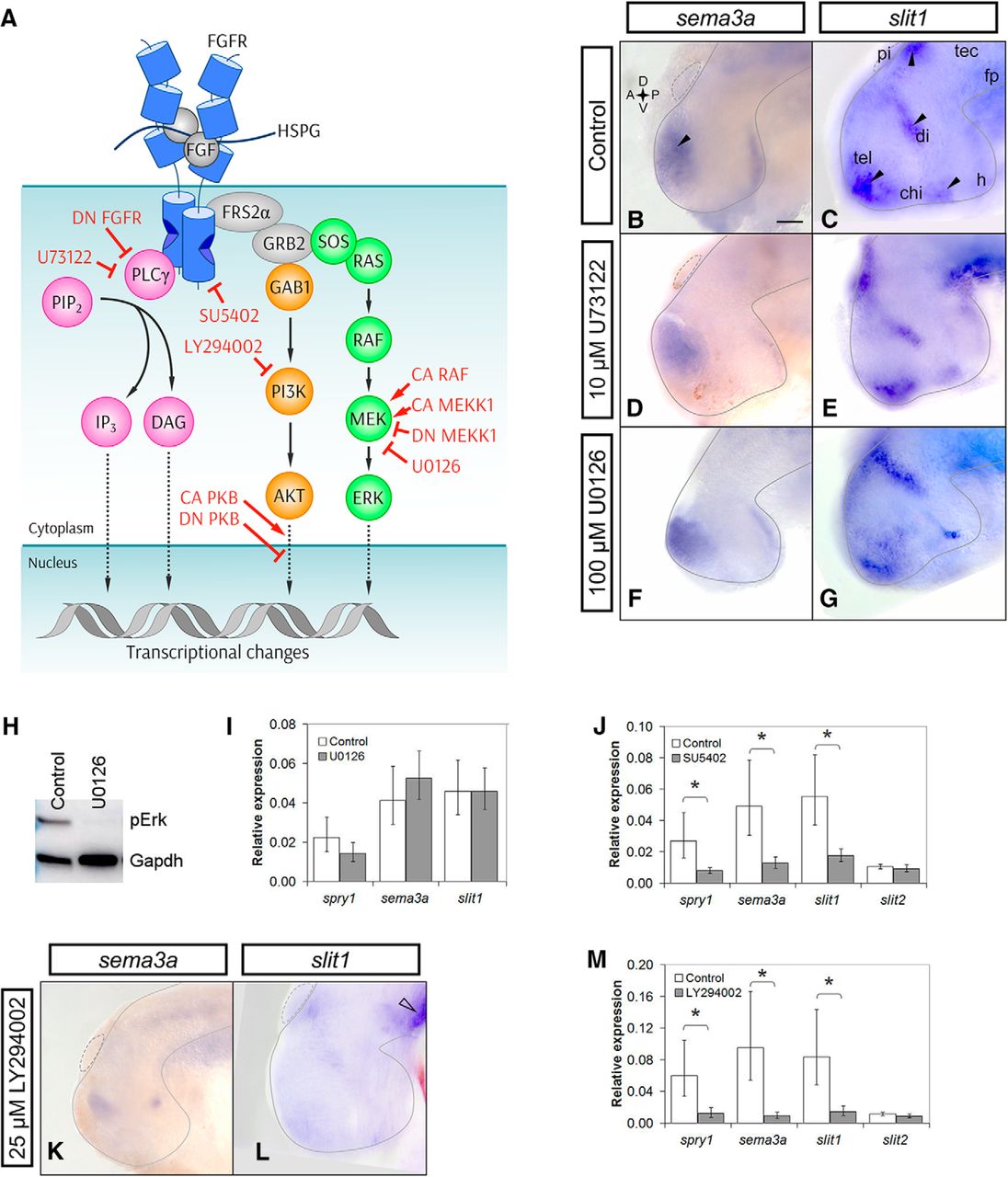 Figure 4. PI3K inhibition decreases both sema3a and slit1 expression in the forebrain. A, The canonical sequence of Fgf signaling intermediates is indicated by solid arrows. Dotted arrows show further signaling through downstream factors (Rodriguez-Viciana et al., 1994; Zimmermann and Moelling, 1999; Jiminez et al., 2002; Nakayama et al., 2008; Aksamitiene et al., 2012; Mendoza et al., 2011; Chen et al., 2012; Selvaraj et al., 2014). The activated complex of HSPG-FGF-FGFR dimerizes to phosphorylate the FGFR intracellular tails and recruits FRS2α, GRB2, GAB1, SOS, and RAS (Rubinfeld and Seger, 2004; Lemmon and Schlessinger, 2010). GAB1 activates the PI3K-AKT relay (orange). RAS activates the RAF-MEK-ERK cascade, i.e., MAPK signaling (green). PLCγ can directly bind to the phosphorylated FGFR to hydrolyze PIP2 to IP3 and DAG (magenta). The inhibitors against FGFRs, MEK, PI3K, and PLCγ are SU5402, U0126, LY294002, and U73122, respectively. CA RAF and CA MEKK1 were used to overactivate the ERK MAPK pathway. DN MEKK1 was used to inhibit the MAPK pathway. The CA and DN PKB (AKT) constructs were used for gain and loss of function of AKT signaling, respectively. Wild-type PLCγ was overexpressed to increase PLCγ signaling, and the PLCγ-deficient DN FGFR was used to inhibit PLCγ activation. BâG, Stage 32 brains were treated with control (B, n = 46 brains, N = 4; C, n = 39 brains, N = 3) or 10 µM U73122 solution and processed by wholemount ISH for sema3a (D, n = 12 brains, N = 3) and slit1 (E, n = 11 brains, N = 2). Black arrowheads indicate the sema3a and slit1 domains of interest. Mek inhibition with 100 µM U0126 treatment did not visibly decrease sema3a (F, n = 11 brains, N = 2) or slit1 (G, n = 11 brains, N = 2) expression by wholemount ISH. H, Phospho-Erk (pErk) knockdown in U0126-treated forebrains confirmed by Western blot analysis (n = 18 brains and N = 3 for both treated and control). I, J, RT-qPCR of sema3a and slit1 forebrain mRNA following treatment with U0126 (I, n = 23 brains and N = 4 for both U0126 and control) and 100 µM SU5402 (J, n = 17 brains and N = 3 for both SU5402 and control). KâM, PI3K inhibition with 25 µM LY294002 treatment decreased sema3a (K, n = 15/20 LY294002 brains had decreased expression vs the control in B, N = 3) and slit1 (L, n = 11/15 LY294002 brains had decreased expression vs the control in C, N = 2) expression by ISH. slit1 expression in the floor plate (L, unfilled arrowhead) was unaffected by LY294002 treatment. M, RT-qPCR for sema3a and slit1 mRNA with LY294002 treatment (n = 11 brains and N = 2 for both LY294002 and control). In all RT-qPCR data, bars represent the mean ± SEM; *p < 0.05 using the REST algorithm for statistical significance. Scale bar, 50 µm. chi, optic chiasm; di, diencephalon; fp, floor plate; h, hypothalamus; pi, pineal gland; tec, optic tectum; tel, telencephalon. |