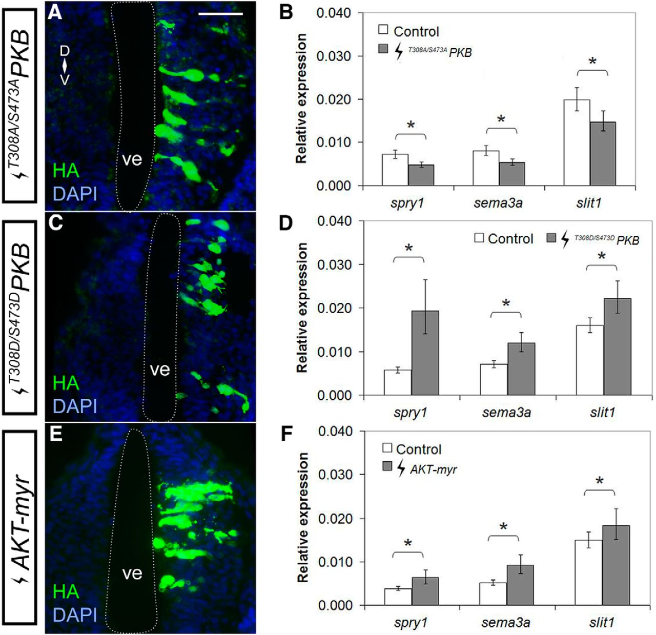 Figure 6. Akt signaling positively regulates sema3a and slit1 in the forebrain. Plasmids encoding DN AKT (A, B) T308A/S473APKB, and CA AKT (C, D) T308D/S473DPKB, and (E, F) AKT-myr were electroporated into the forebrain of stage 27/28 embryos. A, C, E, Forebrain transgene expression was assessed by immunohistochemistry for HA-tagged AKT mutants. B, D, F, spry1, sema3a, and slit1 expression in the forebrain 24 h after electroporation was quantified by RT-qPCR for (B) T308A/S473APKB (n = 21, N = 3 vs control n = 23, N = 3), (D) T308D/S473DPKB (n = 40, N = 5 vs control n = 39, N = 5), and (F) AKT-myr (n = 22, N = 3 vs control n = 24, N = 3), where the control electroporation was pCS2-GFP. Bars represent the mean ± SEM; *p < 0.05 using the REST algorithm for statistical significance. Scale bar, 50 µm. ve, ventricle. |
