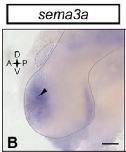 sema3a (semaphorin 3A) gene expression in brain of Xenopus laevis embryo, assayed via in situ hybridization, NF stage 32, lateral view, anterior left, dorsal up. |