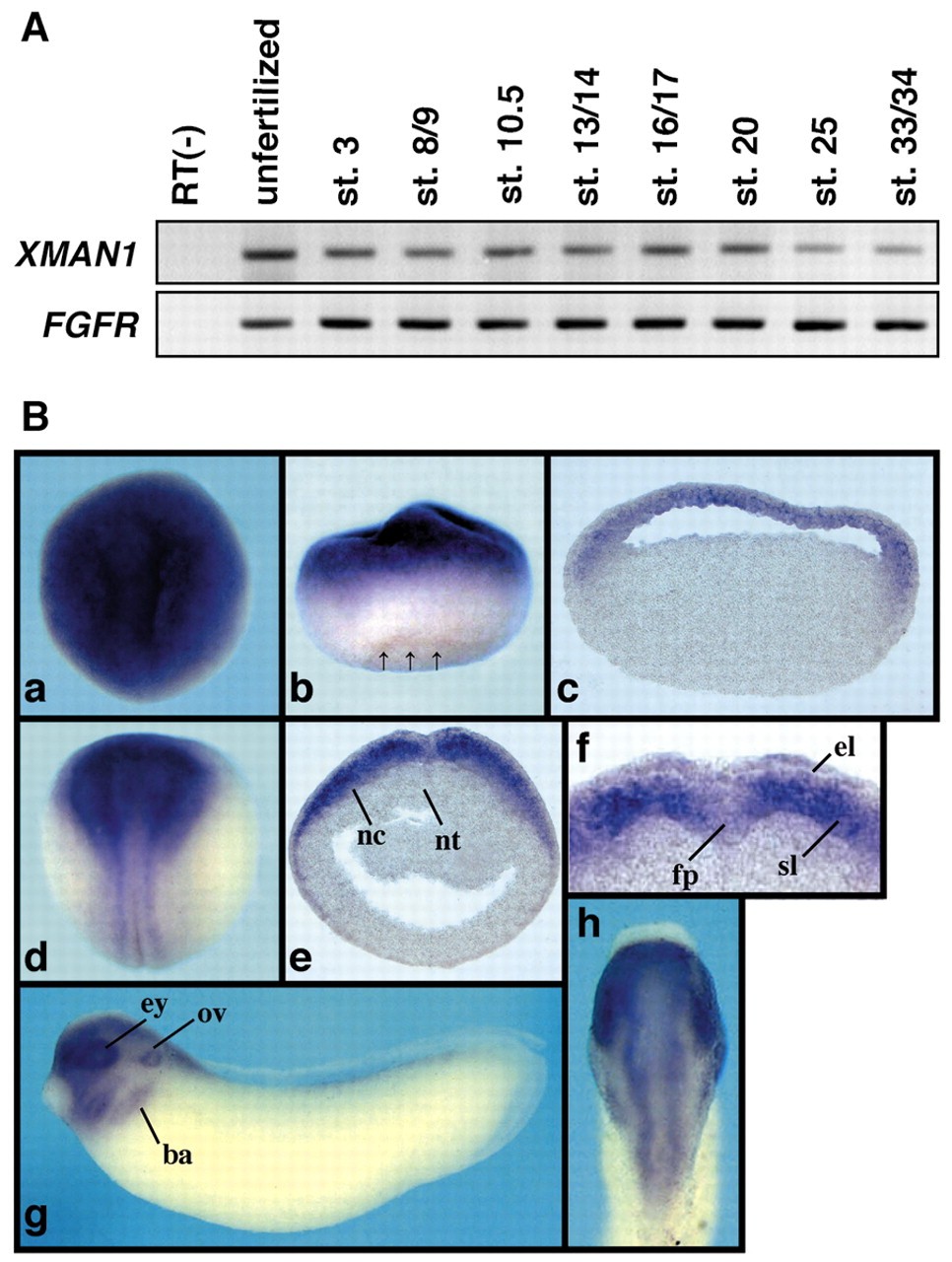 Fig. 3. Temporospatial expression of XMAN1. (A) Analysis of temporal expression pattern of XMAN1 by RT-PCR with RNA from various developmental stages. FGFR, a loading control. (B) Whole-mount in situ analysis of Xenopus embryos at early gastrula (a-c), neurula (d-f) and tadpole (g,h) stages. c and e show cross-sections of b and d, respectively. f represents a close view of the dorsal region of e. h shows a dorsal view of the head region of g. Arrows, dorsal blastopore groove. nc, neural crest; nt, notochord; fp, floor plate; el, epithelial layer; sl, sensory layer; ey, eye; ov, otic vesicle; ba, branchial arches.