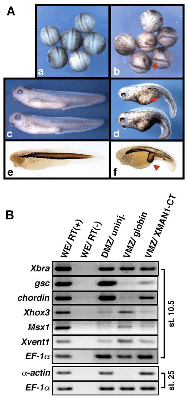 Fig. 5. XMAN1 dorsalizes the ventralmesoderm. (A) Embryos were injected with β -globin (a,c,e) or XMAN1-CT (b,d,f) mRNA into the ventral marginal zone at the four-cell stage and observed at stage 20 (a,b) or stage 35 (c-f). Somites were stained with 12/101 antibody (e,f). Arrowheads, secondary axes. (B) RT-PCR analysis of RNA from β-globin or XMAN1-CT mRNA (500 pg per embryo)-injected ventral marginal zones for expression of pan-mesodermal (Xbra), dorsal (gsc, chordin and α-actin) and ventral (Xhox3, Msx1 and Xvent1) mesodermal markers.