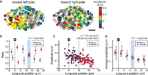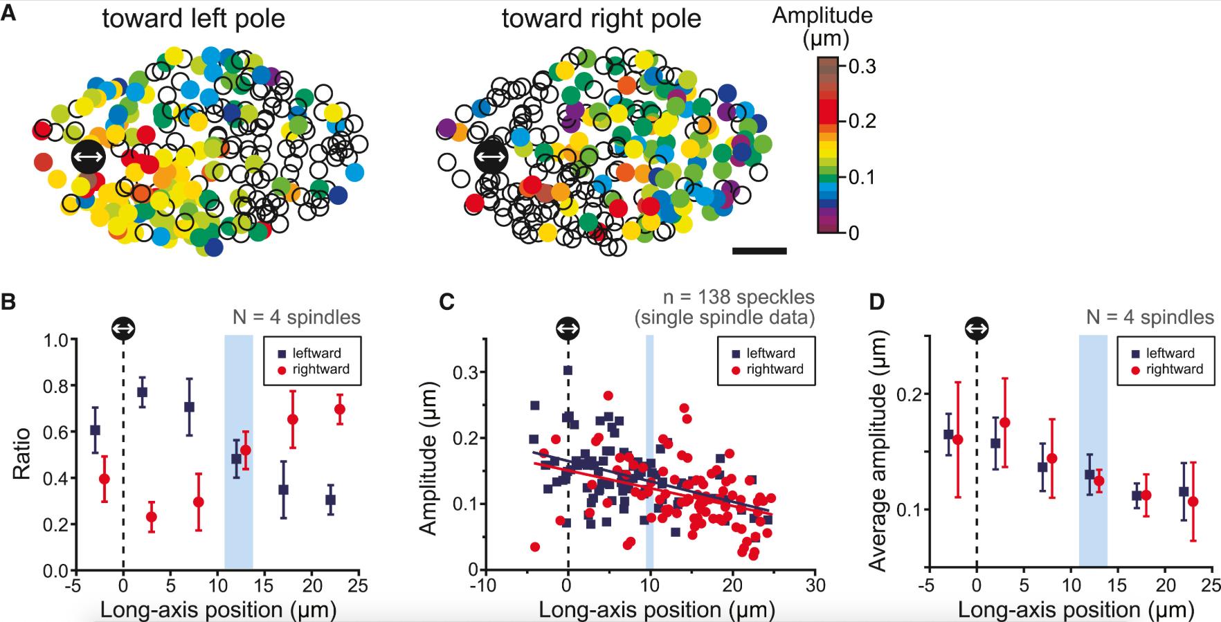 Figure 3. Local Mechanical Responses of Spindle Microtubules Are Independent of Filament Polarity (A) Two-dimensional heatmaps showing the dependency of speckle motion amplitude on microtubule polarity. Speckles that had been moving toward the left and right spindle poles (tracked over â¥10 s) were analyzed for their directionality and mapped in separate panels. Black circle, force application location (frequency: 0.1 Hz; amplitude: 0.25 nN). Warmer color indicates larger amplitude response. Open circles in each map are the fraction of speckles that were assigned the opposite polarity. (B) Ratio of leftward- versus rightward-moving speckles (blue squares and red circles, respectively) as a function of the position along the long spindle axis. Data from n = 4 spindles were pooled and averaged at each 5 μm bin. Bars are SDs. (C) Representative speckle motion amplitude obtained from a single bipolar spindle. Individual speckle motion amplitude in (A) is projected along the long spindle axis. Speckles moving toward the left and right spindle poles are plotted in different symbols (blue squares and red circles, respectively). (D) Averaged motion amplitude of leftward- and rightward-moving speckles at different spindle location, obtained from n = 4 spindles. Data as in (C) are pooled and averaged at each 5 μm bin. Bars are SDs. The light blue box indicates the range of equatorial position. Other marks are as in Figure 1. |