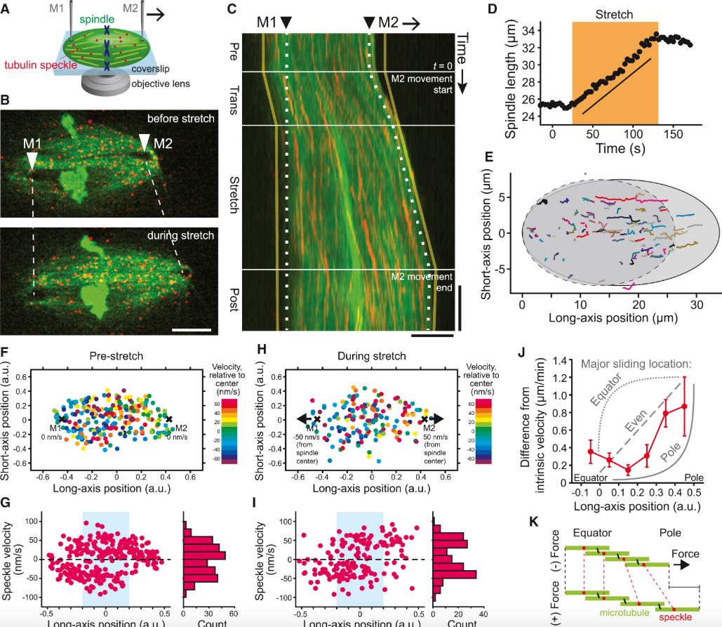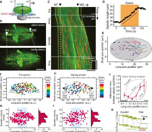 Figure 4. Spindle Length Change Is Coupled with Sliding of Microtubule Arrays at the Middle of the Spindle Half (A) Dual microneedle-based setup for examining the microtubule sliding dynamics associated with spindle length change. Microtubules were double-labeled with X-rhodamine-tubulin (red, 20 nM) and Alexa 488-tubulin (green, 400 nM) for speckle imaging and spindle length measurement, respectively. One microneedle (M1) is used to pin down the spindle while the other (M2) can be moved at 100 nm/s to apply outward stretching force. (B) Confocal snapshots of a spindle before and during the course of a stretch. Merged images of labeled tubulins (red, X-rhodamine; green, Alexa 488) are shown. Chromosomes were also labeled with SYTOX green dye. Dashed lines indicate changes in microneedle tip positions. Scale bar, 10 μm. (C) Kymograph generated along the spindleâs pole-to-pole axis in (B) (line width: 3 μm). White dotted lines, microneedle tip positions. Yellow solid lines, spindle pole positions. Following the onset of microneedle movement (t = 0), the spindle underwent a brief period of parallel translocation (0â25 s, labeled âTransâ) and was then stretched at a nearly constant velocity (25â135 s, labeled âStretchâ). Horizontal scale bar, 10 μm; vertical scale bar, 20 s. (D) Time course of spindle length change. Orange highlighted area indicates the period over which the spindle was stretched. Slope is 94 nm/s (R2 = 0.98) by linear regression. The following analyses were performed at this steady-stretching phase (orange highlighted). (E) Speckle motion response. Trajectories of individual speckles that could be tracked for â¥10 s were projected onto a single imaging plane. Gray ovals with dashed and solid lines are approximate spindle positions at the onset and the end of stretch, respectively. (FâI) Speckle velocity analyzed before stretch (F and G) and during steady stretching phase (H and I). Heatmaps (F and H) were generated on the basis of the average velocity of individual tubulin speckles relative to spindle center and plotted at their initial position along the spindle axes. (G and I) Dependence of speckle velocity on the position along the long spindle axis. Histograms indicate overall velocity distribution of all the speckles analyzed. (J and K) (J) Magnitude of the change in average speckle velocity upon application of a stretching force, plotted against the long-axis spindle position (0, equator; 0.5, pole). Data obtained from n = 4 spindles were pooled and averaged at every 0.1 relative spindle position bin. Plots are mean ± SD. Gray lines are trends predicted from a simple filament array model (K) (see also Figure S4C), which assumes that the predominant relative filament sliding occurred either evenly across the spindle (dashed line), near the pole (solid line), or near the equator (dotted line). See also Figure S4. |