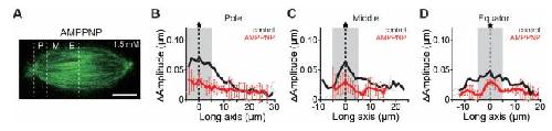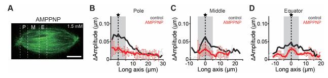 Figure S5. Effect of AMPPNP on the local mechanical responses of microtubules to an applied force, related to Figure 5 (A) Confocal snapshot of a metaphase spindle assembled in extract and treated with 1.5 mM AMPPNP. Shown is the fluorescence signal from Alexa-488 tubulin (400 nM). X-rhodamine tubulin was also added to the extract for speckle imaging. Scale bar, 10 µm. (BâD) Averaged speckle motion amplitude profiles obtained from n = 3 spindles treated with AMPPNP (red), by applying an oscillatory force (frequency: 0.1 Hz) along the long spindle axis and near the pole (B), at the middle of the spindle half (C), or near the equator (D). Plots are mean ± SEM. Star with dotted line indicates force application location. The profiles obtained from unperturbed control (n = 5) are also shown. Note that the control data were obtained from different extract preparations |