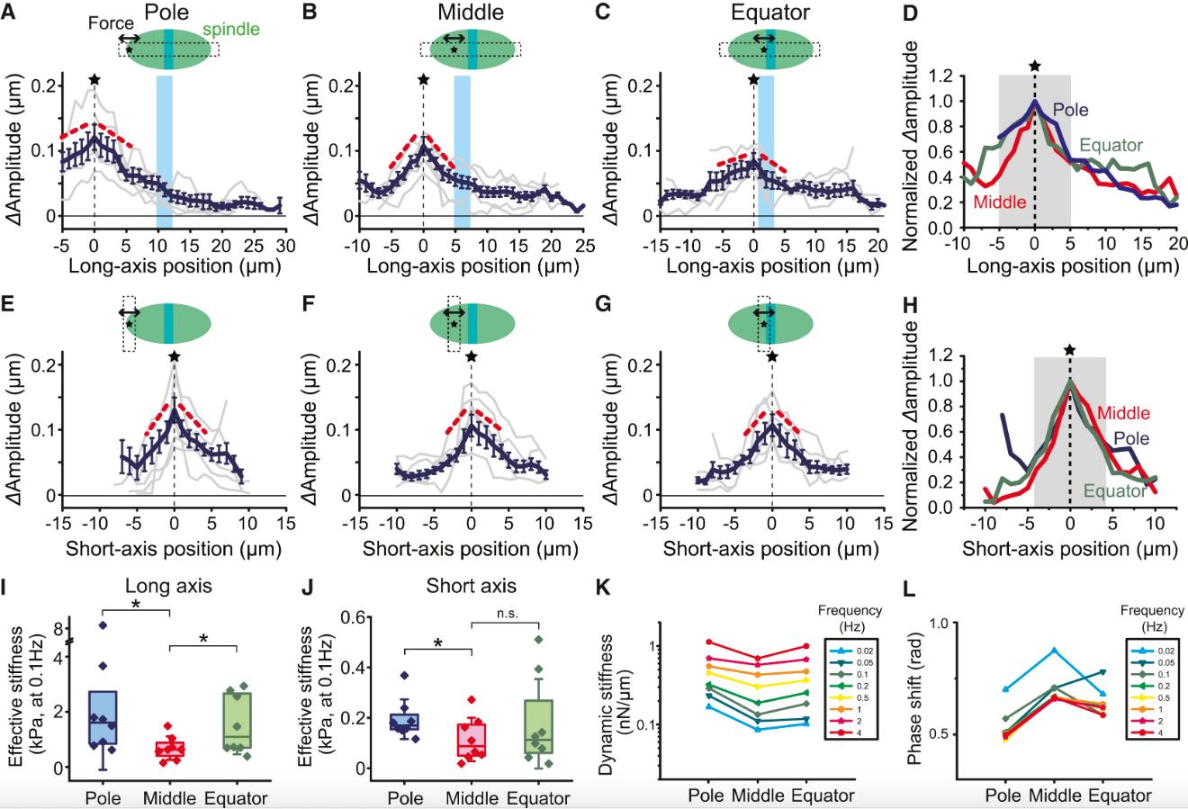 Figure 2. Microtubule Arrays at the Middle of the Spindle Half Are More Mechanically Compliant Than Those near the Pole and the Equator (AâC) Magnitude of speckle motion response (ÎAmplitude) depending on position along the long spindle axis, examined using an oscillatory force (0.1 Hz) applied near the spindle pole (A), at the middle of the spindle half (B), and near the equator (C). Data from multiple spindles (gray lines, n = 8) were pooled and averaged at 1 μm bin width (navy plots). Bars are SEM. Vertical bars in light blue, approximate equatorial position. Red dashed lines, slopes within ±5 μm from the peak. (D) The averaged profiles in (A)â(C) were each normalized to the peak value and overlaid at the peak position. (EâG) The data in (A)â(C) were analyzed for speckles that located along the short spindle axis. (H) Normalized amplitude profiles of (E)â(G) generated as in (D). (I and J) Local effective stiffness at each spindle region, estimated within ±5 μm from the peak, along the long (I) and shot (J) spindle axis (n = 8). Boxplots are displayed with 25% and 75% percentiles and a line at the median. Bars are SDs. âp < 0.05, Wilcoxon signed-rank test. n.s., not significant. (K and L) Local mechanical properties of the spindle, measured by microrheology (see Figure S3). Oscillatory forces were applied along the long spindle axis and at a range of frequencies (0.02â4 Hz) (n = 10 at each spindle location). Dynamic stiffness (K) represents total mechanical resistance associated with viscous and elastic deformations. Phase shift (L) is a measure of the structureâs fluidity (θ = 0 and Ï/2 rad, pure elastic and pure viscous, respectively). See also Figures S2 and S3. |