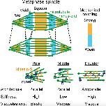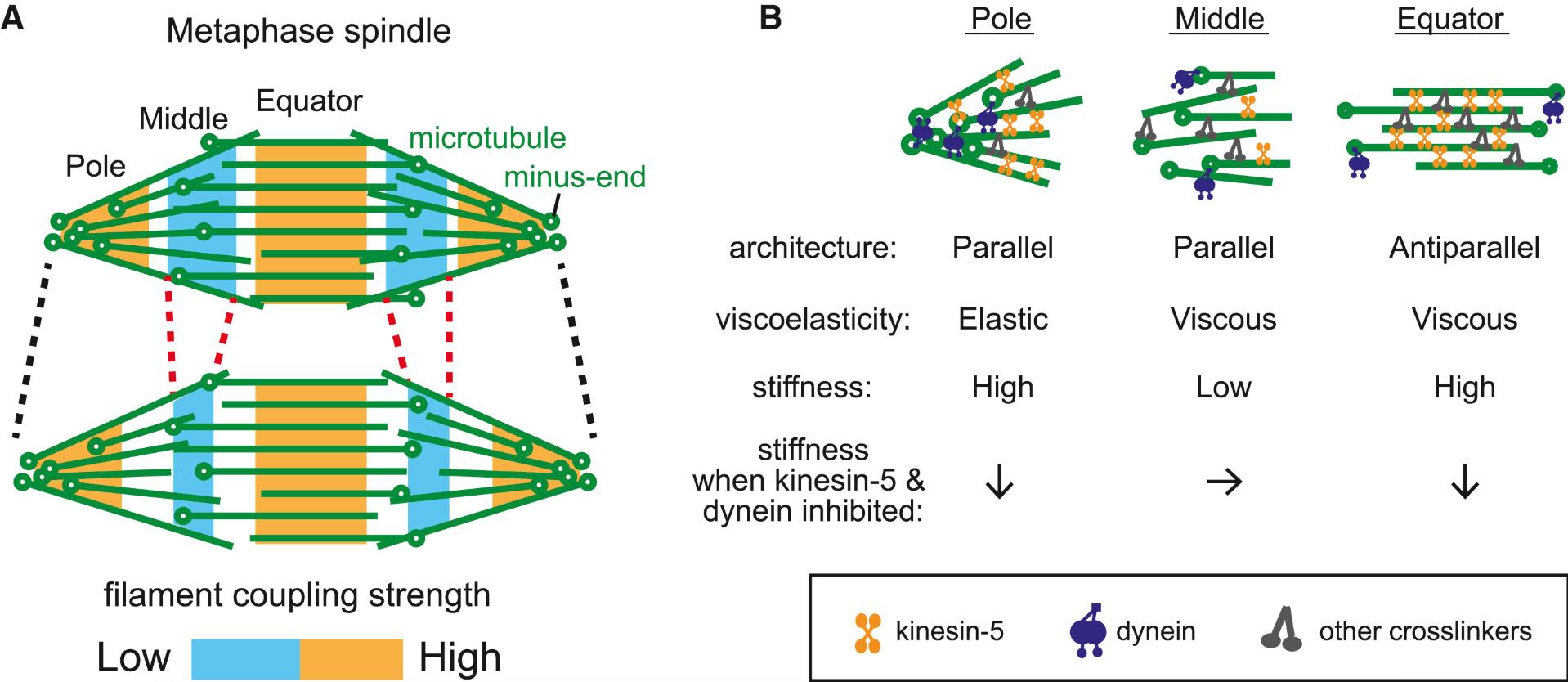 Figure 6. Model for the Local Mechanical Architecture of the Metaphase Spindle (A) Schematic of our spindle micromechanics model. Open circles, microtubule minus ends. Short antiparallel microtubules assemble around the equator, whereas parallel microtubules assemble around the pole. The ends of the equatorial and polar microtubule arrays overlap at the middle of the spindle half (highlighted in blue) and form predominantly parallel filament arrays. This array has large mechanical compliance and can thus slide apart associated with spindle length change (red dotted lines). The filament arrays around the pole and the equator are mechanically robust and maintain their steady-state architecture against perturbing forces (highlighted in orange). (B) Schematic of the local filament architecture and associated mechanical properties in the spindle. Predicted localization of filament crosslinkers is also shown. Filament coupling is the weakest at the middle of the spindle half. Filament arrays are more elastic around the pole and viscous nearer the equator. Upon inhibition of kinesin-5 (orange) and dynein (blue), the stiffness at the pole and the equator is reduced. The stiffness at the middle of the spindle half is insensitive to the motor protein inhibition. As a result, the overall structure becomes less mechanically heterogeneous along the long spindle axis but can retain nearly a half of the unperturbed stiffness likely because of other filament crosslinkers (gray molecules). |