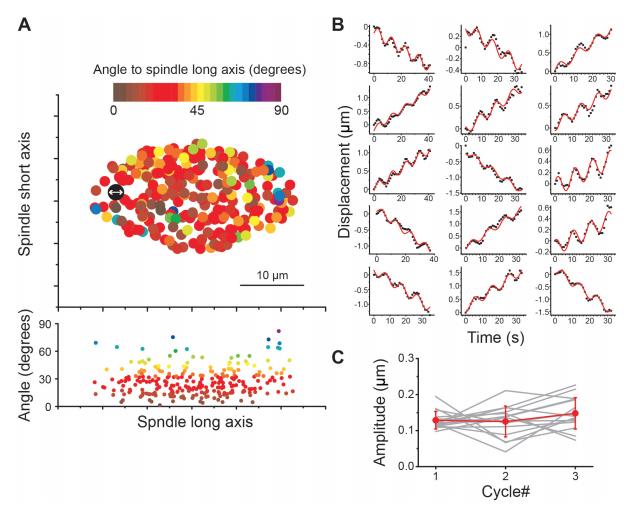 Figure S1. Additional data on the oscillatory force perturbation experiment, related to Figure 1 (A) Heat map showing the orientation of each speckle movement that arose in response to an applied oscillatory force (0.1 Hz). Force was applied along the long spindle axis. Warmer color represents speckle movement more parallel to the long spindle axis. Black circle, force application location. Also shown in the lower panel is the projection of individual data plots onto the long spindle axis. (B) Representative time recordings of speckle movement (black circles), observed in a spindle during an oscillatory force perturbation experiment (frequency: 0.1 Hz). Each time recording was fit to a sinusoidal function (red curves) to determine the amplitude of speckle motion response. (C) Amplitude of speckle motion response (red, averaged; grey, individual speckle data) at each perturbation cycle. |
