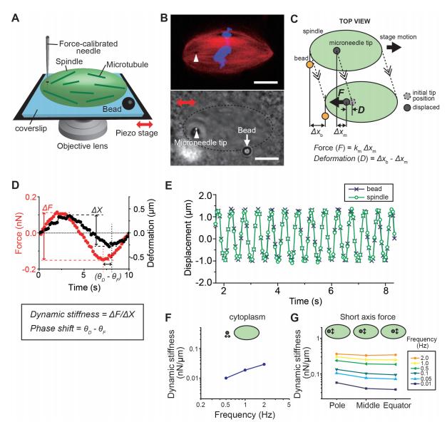 Figure S3. Local stiffness measurement by microrheology, related to Figure 2 (A) Schematic showing the setup used for the microrheology analysis (Fig. 2K, L), for examining the local mechanical properties of the metaphase spindle. The setup is based on one presented in Fig. 1, but with following modifications. First, instead of moving the microneedle base, the spindle, which is firmly attached to coverslip surface, is moved in a sinusoidal manner by translocating the piezo-based sample stage (red double-arrow). Second, a tracer microbead is attached to coverslip surface for tracking the spindle position (black circle). These modifications allowed us to analyze spindle force and deformation using bright-field imaging, at a sufficiently fast sampling rate. (B) Representative confocal image of a spindle (upper panel; red, X-rhodamine-tubulin; blue, SYTOX dye) and the corresponding bright-field image (lower panel) showing the position of the microneedle tip (white arrowhead) and a tracer microbead (white arrow). (C) Schematic showing the procedure to calculate force and deformation developed in the spindle. The amount of force developed (F) can be determined based on the microneedle tipâs displacement (xm) and its pre-calibrated stiffness (km), according to F = km xm. The associated spindle deformation (D) can be estimated from the difference in displacements between the microneedle tip (xm) and the microbead (xb), according to D = xb â xm. The force and deformation magnitudes were calculated across the time-lapse image to generate time courses as in (D), and then fit to the following sinusoidal function: F(t) = F0 sin (Ït + θF) and D(t) = D0 sin (Ït + θD). Here, Ï and θ are the input frequency and the oscillatory phase, respectively. The dynamic stiffness is given by G* = F0/D0. The phase shift (δ), the measure of how solid-like (δ = 0) or fluid-like (δ = Ï/2) the structure is, is given by δ = θD â θF. (E) Time recordings of tracer microbead (blue cross) and spindle (green square) motions acquired during the microrheology measurement. Edges of a microbead (bright-field image) and a spindle (fluorescence image) were tracked across time-lapse sequence. Non-linear sinusoidal fit yielded <3% difference in their oscillatory amplitudes. (F, G) Effective stiffness measured in the cytoplasm but outside spindles (F), and in spindles by applying a force along the short spindle axis (G), using the identical measurement setup in (A). |