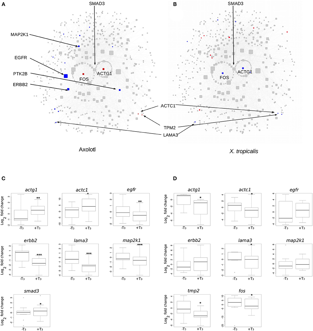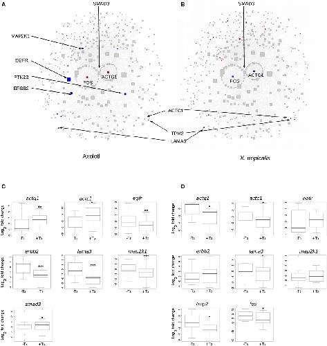 Figure 5. Differential gene expression at the Actg1-Fos subnetwork, in Axolotl and X. tropicalis. (A) Axolotl subnetwork. (B) X. tropicalis subnetwork. The subnetworks are composed of the first (laid out in circle) and second neighbors of Actg1 and Fos nodes. Hubs (nodes with degree >20) are shown with rounded squares. Node size is proportional to their degree (connectivity). Colors indicate differentially expressed genes (red: induced, blue: repressed). Homologous nodes are located at the same place in both networks. (C) RT-qPCR analysis of DE genes in the Axolotl subnetwork. (D) RT-qPCR analysis of DE genes in the X. tropicalis subnetwork. Statistical significance (Mann-Whitney test) with *p ⤠0.05, **p ⤠0.01, ***p ⤠0.001.