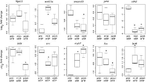 Figure 6. Developmental time course of gene expression. Normalized gene expression changes (log2 Fold Change) before, during or after the endogenous peak of TH, corresponding to pre-, mid-, and post-HTP animals. Statistical significance (Mann-Whitney test) with *p ≤ 0.05.