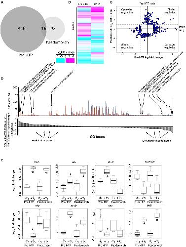 Figure 7. Axolotl tailfin transcriptional responses to T3 at pre-HTP and paedomorph stages. (A) Overlap between T3-responsive gene sets at pre-HTP and 6 months old paedomorph stages, measured by RNA-Seq. (B) Heatmap of differentially expressed genes at pre-HTP and paedomorph stages. (C) Expression fold changes at pre-HTP vs. old paedomorphs. (D) Gene ontology analysis. Top: Number of genes for each GO term (not shown), at both stages. Red: Number (Nbr) of terms found at pre-HTP. Blue: Number of terms found in paedomorph. Bottom: ratio of the number of terms found at each stage for each GO term (in the same order as the top panel). Positive and negative values correspond to terms mostly found at pre-HTP or paedomorph gene set, respectively. (E) RT-qPCR normalized gene expression changes (log2 Fold Change) after T3 treatment. Tailfin transcriptional response to T3 differs between class 3 larvae and 6 months old paedomorphs. Statistical significance (Mann-Whitney test) with *p ≤ 0.05.