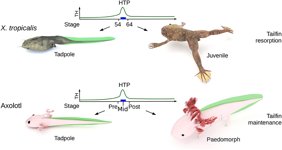 Figure 1. Biological context. The High Thyroid Hormone Period (HTP), that marks the end of tadpole stage (blue rectangle) in X. tropicalis, ignites metamorphosis and the resorption of larval tissues (such as tailfin). In Axolotl, the HTP does not induces tailfin resorption. âpre-HTPâ animals will refer to class 3 Axolotl [as defined by Rosenkilde et al. (23)], when limb buds start growing (around 2 weeks post-hatching). At this stage, endogenous TH level is low and thyroid gland starts releasing TH. âmid-HTPâ animals refer to class 8 Axolotl, with four toes on hind limbs (between 32 and 48 days post-hatching). This stage corresponds to the highest level of endogenous T4. âpost-HTPâ animals refer to class 12 Axolotl (around 3 months old), where T4 endogenous level dropped significantly. X. tropicalis tadpoles were staged according to the normal table of Xenopus laevis (Daudin) of Nieuwkoop and Faber (24). The TH levels are schematized from data of Leloup and Buscaglia (25) for Xenopus and of Rosenkilde et al. (23) for Axolotl. Digital paintings were carried out with BLENDER v2.8b.