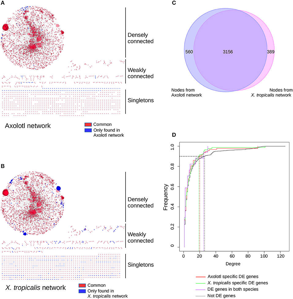 Figure 4. T3 affect a similar network of pathways in both species, despite regulating different sets of genes. Networks of KEGG pathways affected in Axolotl (A) and X. tropicalis (B). The reconstructed network for Axolotl is composed of 3,305 nodes and 12,776 edges, with a densely connected component (2,274 nodes and 12,554 edges), some weakly connected genes (273 genes and 222 edges) and a set of singletons (758 nodes). The X. tropicalis network is composed of 3,561 nodes and 16,237 edges, with a highly interconnected component (2,443 nodes and 15,950 edges), some weakly connected genes (318 genes and 287 edges) and a set of singletons (800 nodes). Nodes correspond to gene products, linked together by the functional interactions described in the pathways (edges). Individual node size is proportional to the number of nodes connected to it. Large nodes thus correspond to hubs between KEGG pathways. Red: nodes in common to both networks. Blue: nodes only found in one (or the other) network. Layout computed with the prefuse force directed algorithm. (C) Overlap between the node (gene product) content of the two networks. (D) Cumulative distribution of node connectivity (degree). In both species, T3 do not target (or avoid) specific network components.
