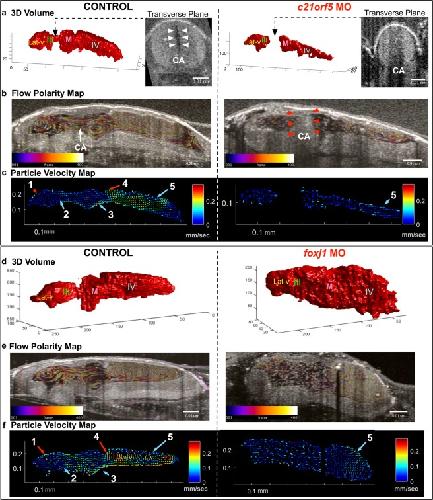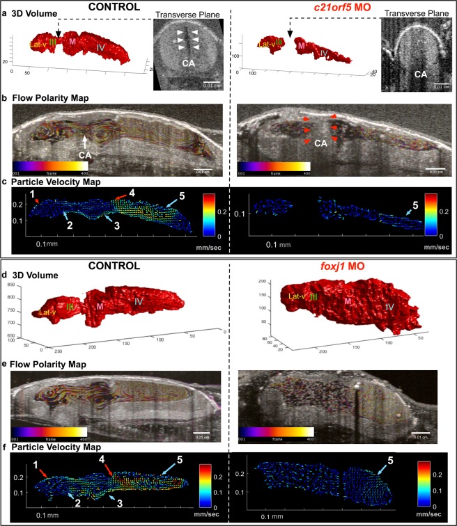 Figure 3. Characterization of c21orf59 and foxj1 morphants. (a) 3D rendering of the tadpole ventricular system shows aqueductal stenosis and a smaller ventricular system in c21orf59 morphants compared to controls and (b,c) flow polarity and particle velocity maps confirm loss of FFs 1-4 as well as diminished flow in FF5. (d) 3D rendering of the tadpole ventricular system shows ventriculomegaly in foxj1 morphants and (e,f) flow polarity and particle velocity map confirm loss of FFs1-4 and slow FF5. (Lat-V: lateral ventricle, III: 3rd ventricle, M: Midbrain ventricle, IV: 4th ventricle). |
