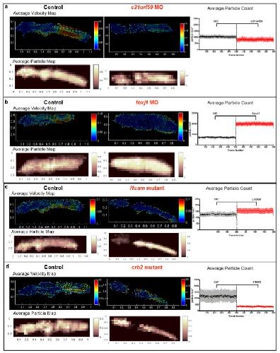 Supplemental Figure 2. Averaged flow maps and average particle distribution heatmaps were created by Procrustes analysis (see methods for details). (a) Average velocity map for c21orf 59 morphants show slower particle velocities. Average particle maps show a globally even presence of particles across the ventricles. Total particle counts were lower in morphants. (b) Average velocity map for foxj1 morphants show slower particle velocities. Average particle maps show uniformly distributed particles across the ventricles. Total particle counts were significantly higher in morphants. (c) Average velocity map for l1cam F0 CRISPR mutants show slightly slower particle velocities but intact flow fields. Average particle maps show an uneven distribution of particles, more present within the midbrain and 4th ventricle compared to the lateral and 3rd ventricle. Total particle counts were higher in mutants. (d) Average velocity map for crb2 F0 CRISPR mutants show slower particle velocities except in distal 4th ventricle. Average particle maps show an uneven particle distribution, with more present within the lateral ventricle. Total particle counts were very low in mutants. (control n=11, c21orf59 MO n=11, foxj1 MO n=11, l1cam F0 CRISPR Mutant n=11, crb2 F0 CRISPR Mutant n=11). |