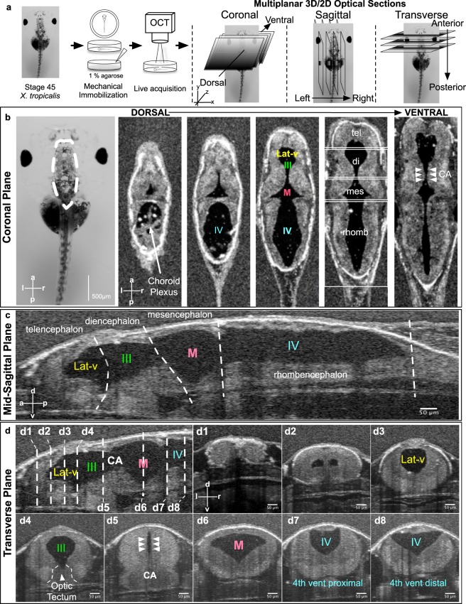 Figure 1. In Vivo OCT imaging of the Xenopus tadpole ventricular system. (a) Stage 45 tadpoles are embedded in 1% low-melt agarose with the dorsal side of the animal facing the OCT beam. 2D and 3D images are taken. (b) A stage 45 tadpole as seen under light microscopy. Far left panel - white dotted line outlines the brain. A series of OCT images taken at progressively more ventral planes show the ventricular system with different parts of the brain. (c) A mid-sagittal view of the ventricular system at the midline. White dotted lines show the boundaries between different brain regions. (d) Transverse sections through the ventricular system along the anterior to posterior axis of the animal (d1âd8). The position of each section corresponds to the white dotted lines shown on the mid-sagittal view in the top left panel. (Lat-V: lateral ventricle, III: 3rd ventricle, M: Midbrain ventricle, IV: 4th ventricle, tel: Telencephalon, di: Diencephalon, mes: Mesencephalon, rhomb: Rhombencephalon, CA: Cerebral aqueduct). |