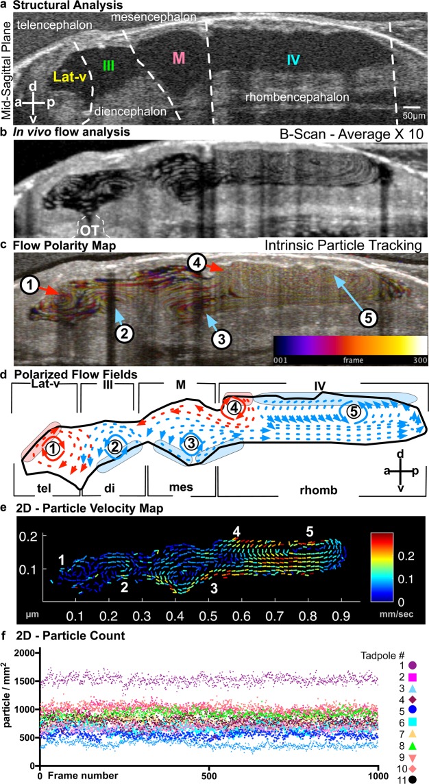 Figure 2. Imaging ventricular CSF flow with OCT. (a) Mid-sagittal view of the brain allowing simultaneous visualization of the four ventricles. (b) B-scan image acquisition using OCT: Ventricles of a stage 45 tadpole harbor native free floating particles. In this image, the spatial position of the particles are recorded over time to demonstrate discrete flow patterns within each ventricle (OT: optical tectum). (c) Intrinsic Particle Tracking: Using ImageJ, we tracked particles using 300 frames of 2D images. Temporal color coding depicts their trajectory over time. Color bar represents color versus corresponding frame number in the color-coded image. Based on the trajectory map, 5 distinct flow fields were observed: FF1-FF5. We numbered flow fields 1 to 5 along the anterior-posterior axis. FF 1-Telencephalic flow and FF 2-Diencephalic flow are in the lateral ventricle. FF 3-Mesencephalic flow is in the 3rd ventricle. Finally, the 4th ventricle has 2 flow fields: FF 4-Anterior Rhombencephalic flow and FF 5-Posterior Rhombencephalic flow. (d) Outline of the ventricular system and vector maps of the CSF flow fields. Based on the trajectory map and real time observation (Movie 3); FF1 and FF4 are clockwise and FF2, 3 and 5 are counter-clockwise. (e) 2D Particle Velocity Map: Particle trajectories averaged across all frames (1000) to form flow velocities (see methods for details). Based on the particle velocity map and real time observations FF1 and FF2 are relatively slower compared to FF 3, 4 and 5. The fastest flow is recorded within the 4th ventricle. (f) 2D Particle Count (nâ=â11): Over 1000 frames, total particle number are counted for 11 different wild type tadpoles and plotted for each frame. |