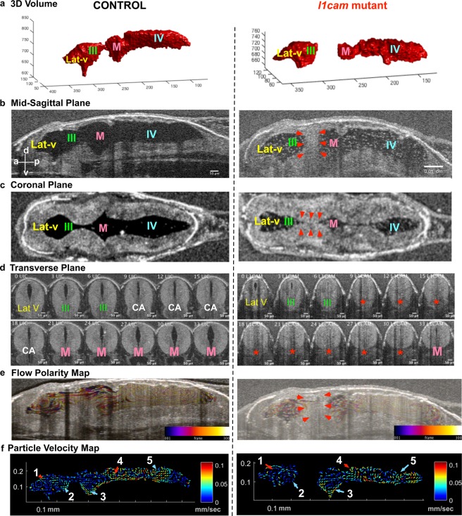 Figure 4. F0 CRISPR mutation in L1CAM causes cerebral aqueduct stenosis. The left column shows control and right column shows l1cam F0 CRISPR mutant images for all panels. (a) 3D rendering of the tadpole ventricular system shows aqueductal stenosis and a smaller ventricular system in l1cam F0 CRISPR mutant. (b) Mid sagittal view and (c) Coronal view of control and l1cam F0 CRISPR mutant, the later showing stenosis of the cerebral aqueduct (red arrowheads). (d) Transverse view of the control and l1cam F0 CRISPR mutant, starting at the end of the lateral ventricle through the cerebral aqueduct and ending in the midbrain ventricle. Control embryo shows normal opening of the duct whereas the mutant shows complete blockage (red star). (e) Relatively normal ciliary flow fields in the control and mutant animals. (f) 2D Particle Velocity Map shows intact FFs 1-5. (Lat-V: lateral ventricle, III: 3rd ventricle, M: Midbrain ventricle, IV: 4th ventricle). |