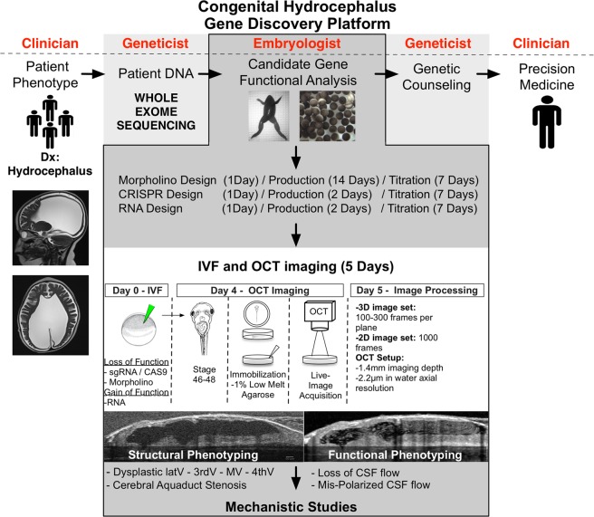Figure 6. Schematic representation of the gene discovery platform for screening novel developmental hydrocephaly genes using Xenopus and OCT as a model system. |