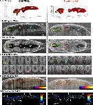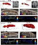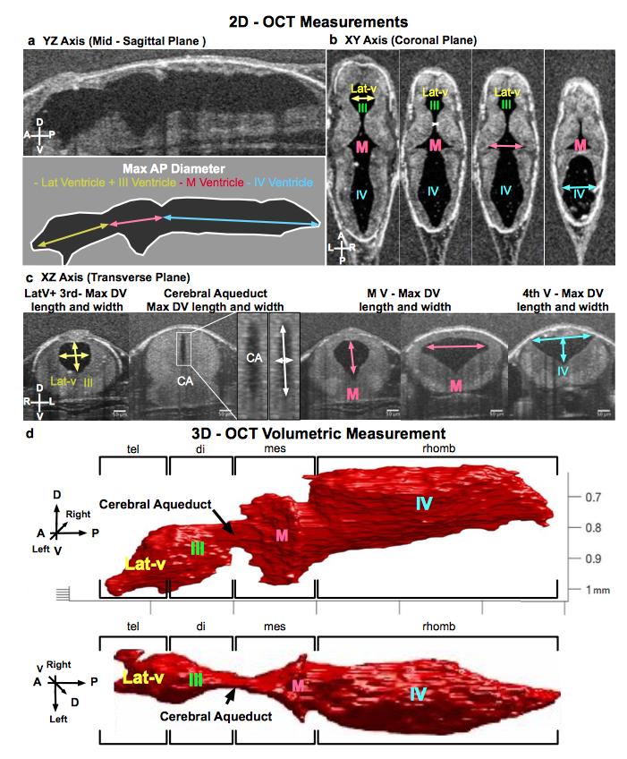 Supplemental Figure 1. Measurements by OCT of the Xenopus tadpole ventricular system. (a) Mid-sagittal view (YZ axis): The dorsal-ventral (DV) plane along the anterior-posterior (AP) axis of the ventricular system. The AP length measurement positions are shown for the lateral ventricle and 3rd ventricle in yellow, midbrain ventricle in purple and 4th in blue. (b) Coronal view (XY axis): The top view of the ventricular system is visualized using the 3D acquisition. The width of each ventricle can be measured in this view along with the CA width. (c) Transverse view (XZ axis): DV height and Left-Right (LR) width for each of the ventricle is shown when moving from anterior to the posterior of the animal. The Lateral and 3rd ventricle is shown at its widest and deepest section followed by the height and width of the Cerebral Aqueduct (CA). The midbrain ventricle is deepest anteriorly and becomes wider as it merges into the 4th ventricle which is shown as the last image. (d) 3D rendering of the ventricular system presented on sagittal and coronal plane. |