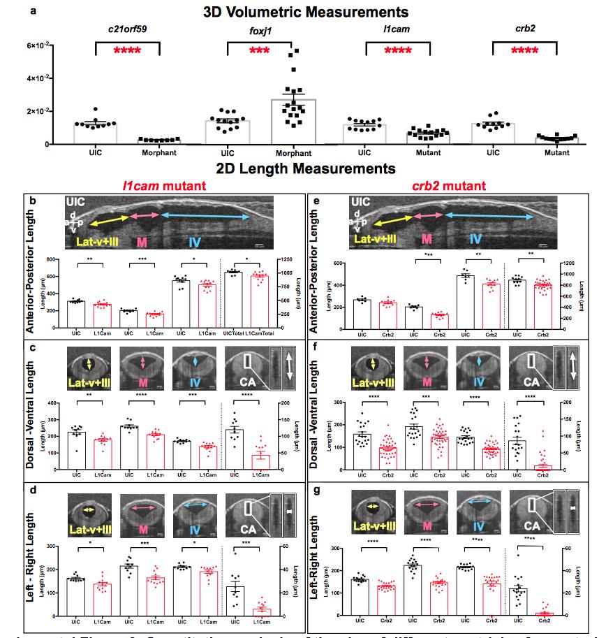 Supplemental Figure 3. Quantitative analysis of the size of different ventricles for control and mutant frogs using OCT. (a) Comparison of 3D volumetric measurements for the ventricular system for c21orf59 and foxj1 morphants and l1cam and crb2 F0 CRISPR mutants with their respective controls. (n=10-20). Schematic representation of position of 2D measurements taken on the control vs. l1cam (left column) and crb2 (right column) F0 CRISPR mutant ventricles are shown at the start of each panel. (b, e) Anterior-posterior length measurements: Mutants show reduced length for individual ventricles as well as of the entire ventricular system. (c, f) Dorsal-ventral height measurements for each ventricle and CA. (d, g) Left-right width for each individual ventricle and the CA. (Total: Total ventricular system length from the most anterior tip of the lateral ventricle to the most posterior tip of the 4th ventricle. *P<0.05, **p<0.01, ***p<0.001, ****p<0.0001. Bars indicate the mean value and each individual data point is shown (n=10-40).) |