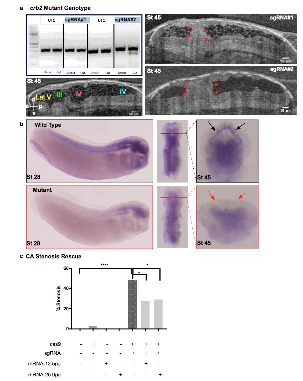 Supplemental Figure 5. Validation of crb2 F0 CRISPR mutant. (a) DNA gel showing the PCR product for each crb2 F0 CRISPR mutant and control, before and after cutting with T7 endonuclease I. Mid sagittal OCT image of control and two independent crb2 F0 CRISPR mutants, the later showing stenosis of the cerebral aqueduct (red arrowheads). (b) At stage 28 crb2 mRNA expression can be seen in the eye and brain with weaker expression in the spinal cord and notochord using in-situ hybridization (n=30). This expression is lost in the mutant animals (n=15). At stage 45, crb2 mRNA is expressed in the whole brain, specifically in the ependymal lining of the ventricles (black arrows in the inset showing a cross section of the brain). This expression is reduced in the mutants (red arrows). (c) Rescue experiment shows a reduction in the proportion of animals that get cerebral aqueduct stenosis when the crb2-sgRNA is co-injected with human WT crb2 mRNA. (sample size for each treatment: control=30, cas9-only=36, sgRNA=66, 12.5pgmRNA=45, 25pgmRNA=55, 12.5pg_mRNA+sgRNA=72, 25pg_mRNA+sgRNA=55). A chi-square test of independence was performed to examine the relation between treatments. *P<0.05, ****p<0.0001. |