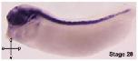 l1cam (L1 cell adhesion molecule) gene expression in Xenopus tropicalis embryo, assayed via in situ hybridization, NF stage 28, lateral view, anterior left, dorsal up. |